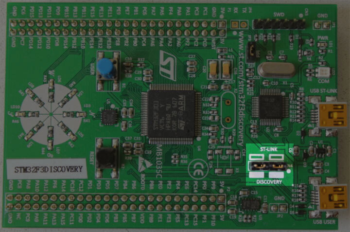 Connect your laptop / PC to the discovery board using a Mini-USB USB cable. The discovery board has two USB connectors; use the one labeled "USB ST-LINK" that sits on the center of the edge of the board.